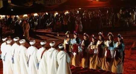 In Morocco's Atlas Mountains, single Berber women attend an annual bride market, accompanied by male relatives. Prospective grooms approach them; if a woman is interested, she lets him hold her hand. Picture a vibrant scene of colorful dresses and tentative conversations.